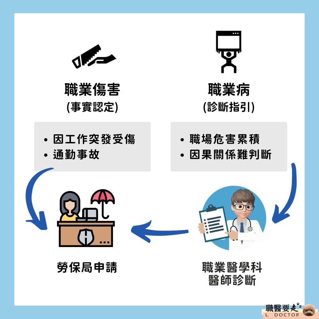 首先,’’職業災害’’可區分成兩大塊:「職業傷害」與「職業病」。