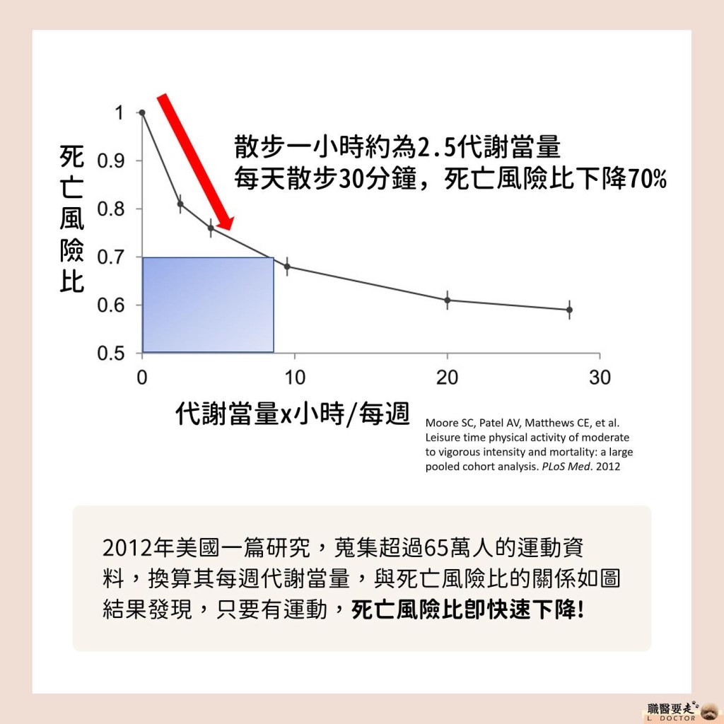 而每週代謝當量x小時接近10時(約略每天散步30分鐘),死亡風險比剩70% (下降30%)