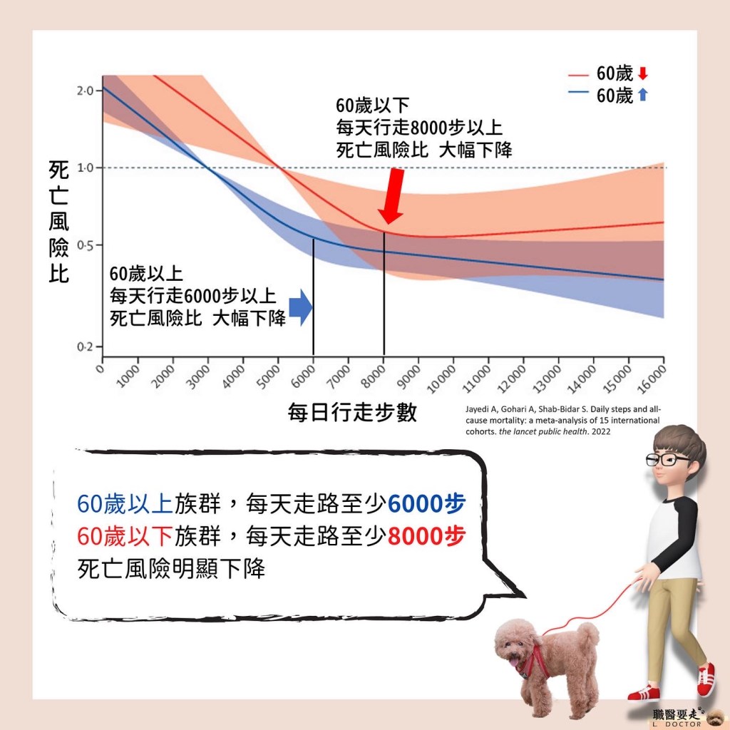 2022年美國一篇研究分析了走路步數與死亡率之間的關係,將15個研究做統合分析(Meta-analysis),共蒐集了將近5萬人,平均每人追蹤了7.1年。其中走路與死亡風險比之間的結果如下: