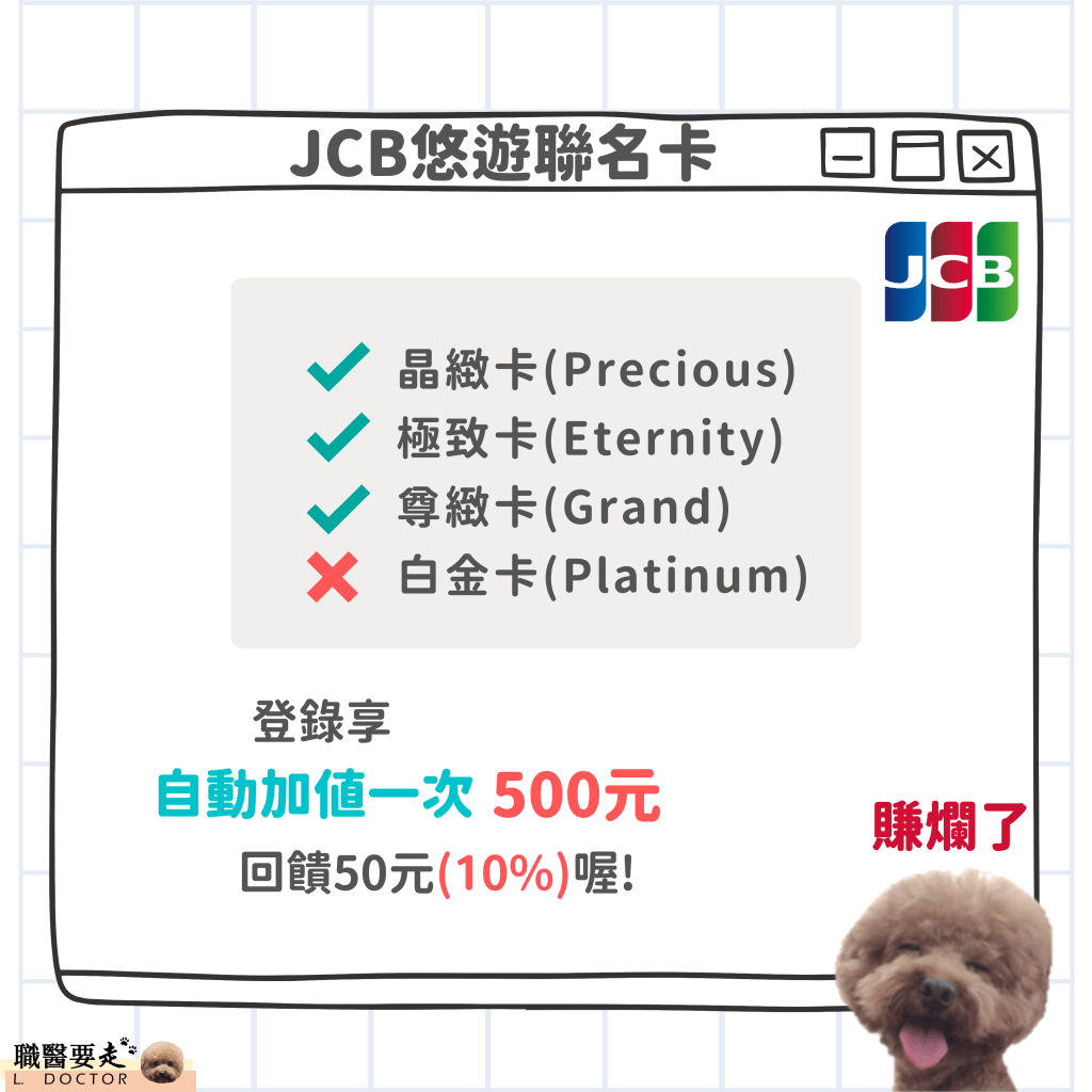 最後提醒一下,只有晶緻卡(Precious)、極緻卡(Eternity)、尊緻卡(Grand)等級的JCB悠遊聯名卡可參加此活動,白金卡(Platinum)等級可是不能參加的喔!!!!!這點請多注意