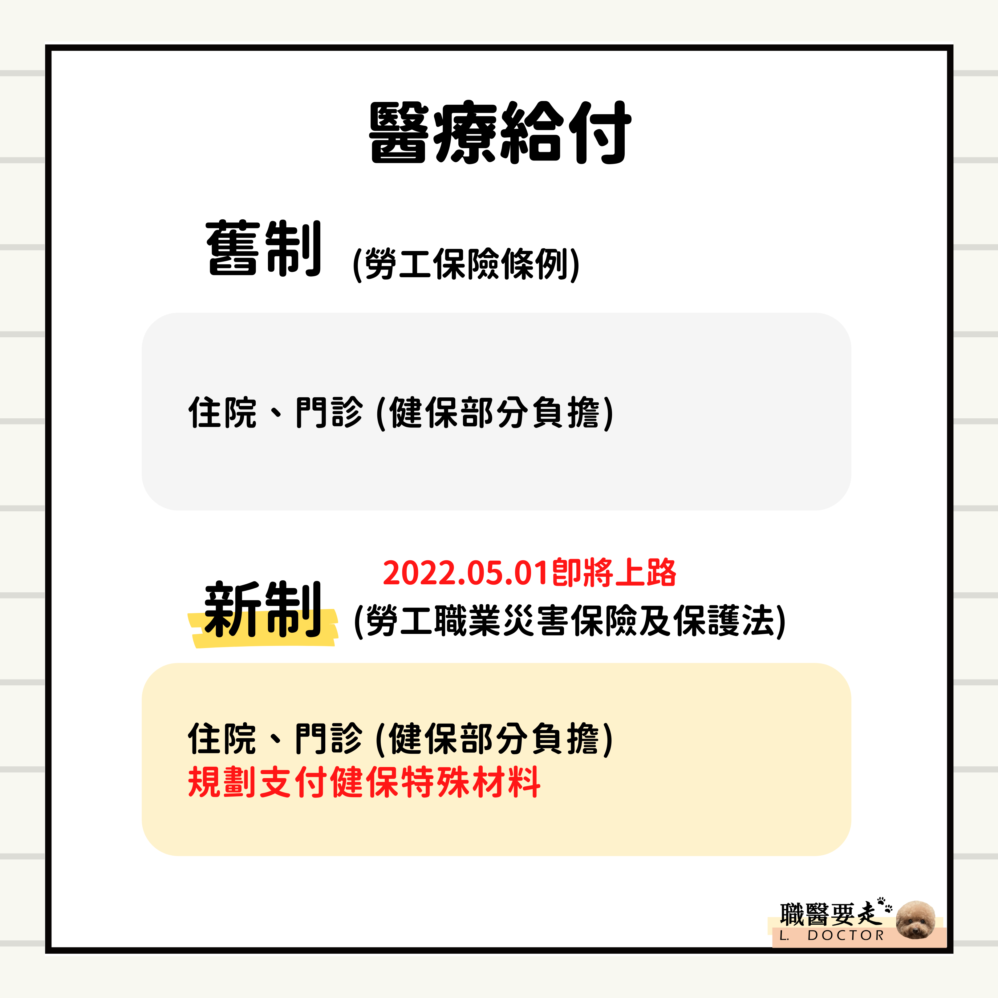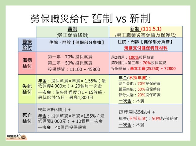 以下針對職災四大給付座新舊制比較與說明: