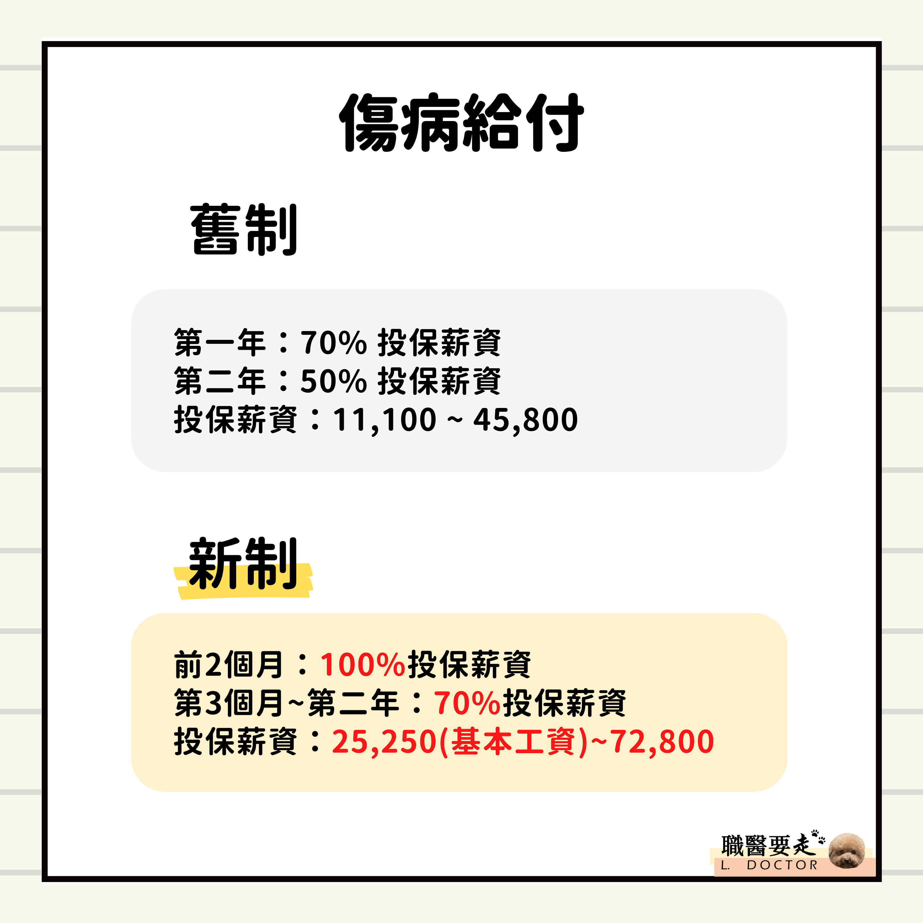 - 舊制:休養期間第一年給予70%投保薪資,第二年給予50%投保薪資,投保薪資範圍從11100~45800。