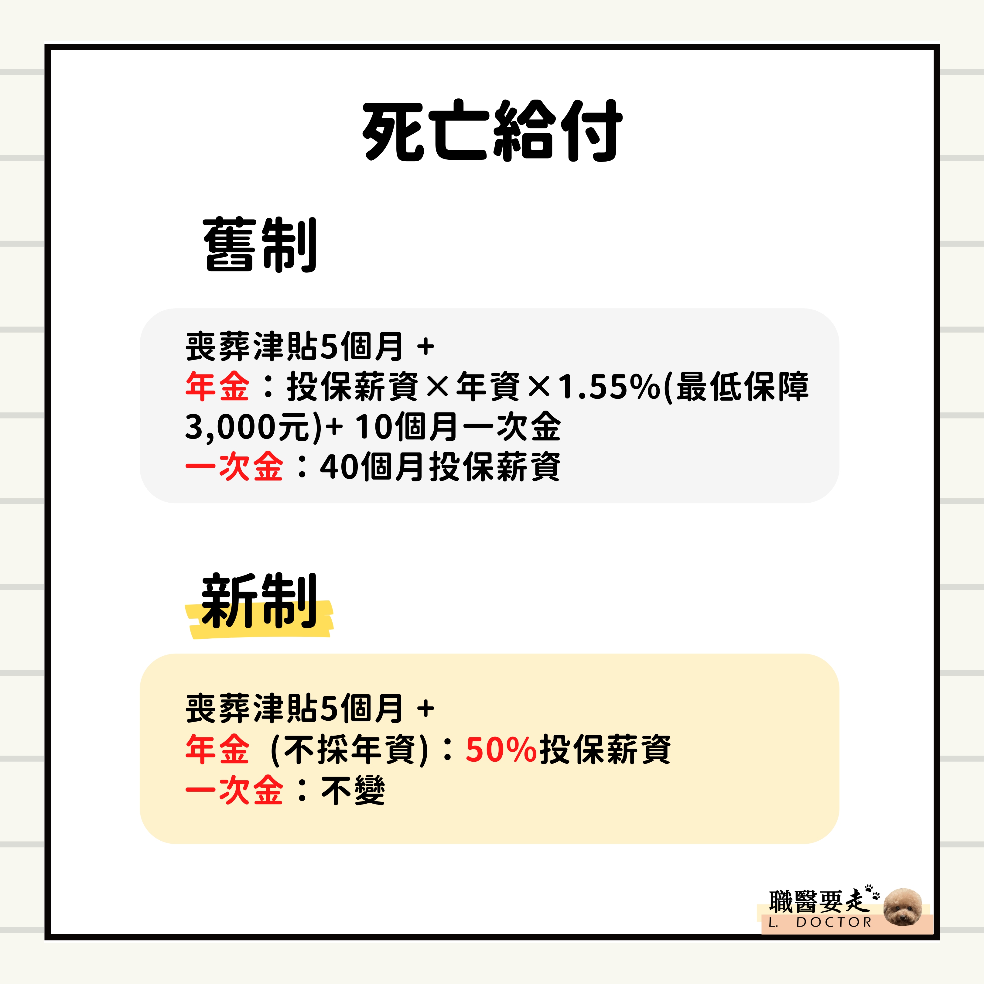 - 新制年金統一為50%投保薪資。