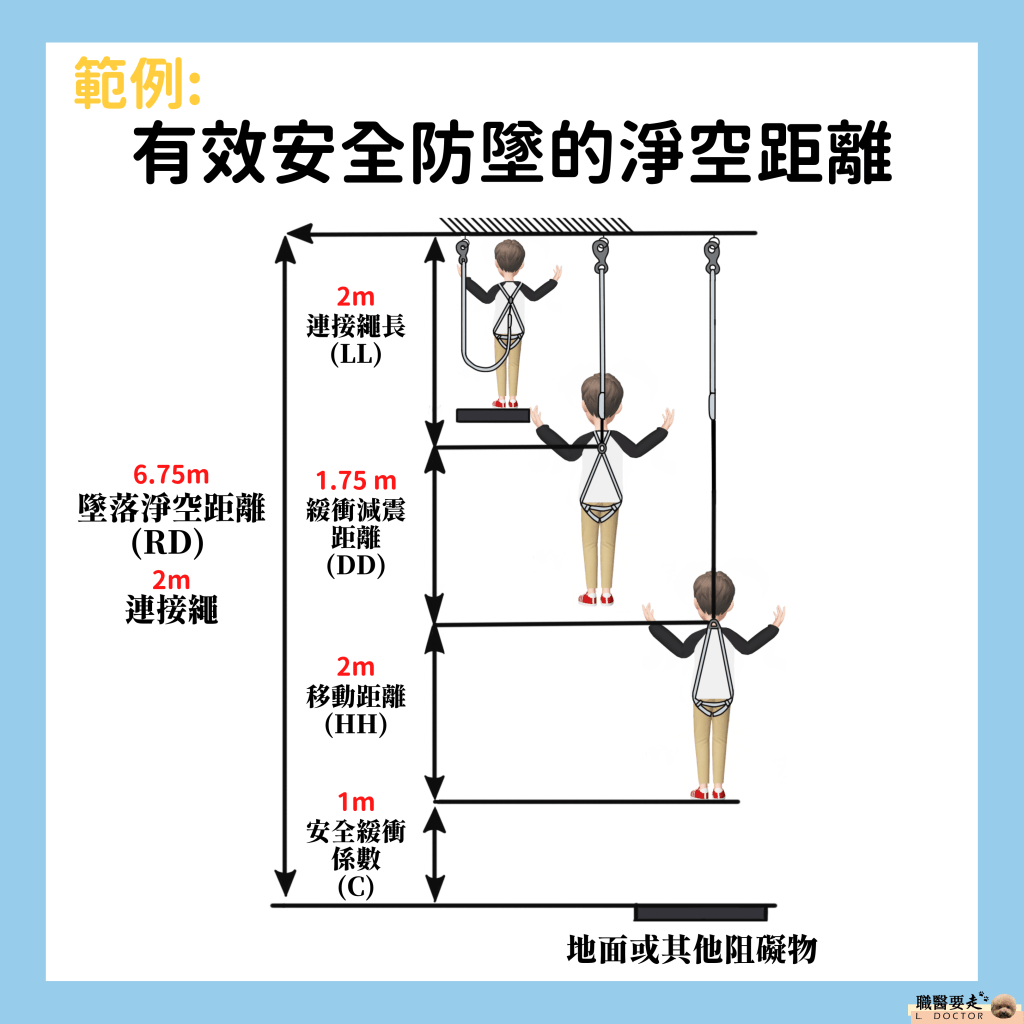 墜落淨空距離(RD)=連繫繩長(LL)+緩衝減震距離(DD)+移動距離(HH)+安全緩衝係數(C)