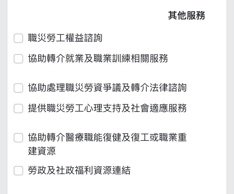 1. 職災勞工權益諮詢:例如勞保醫療/傷病給付、公傷假勤、就業權益等