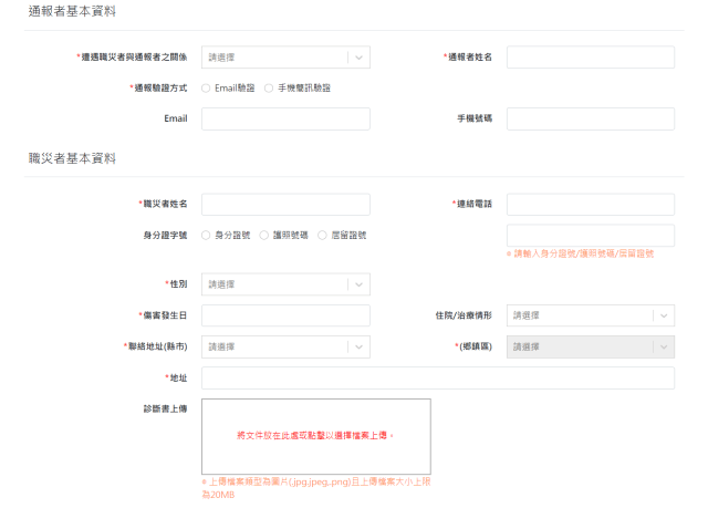 通報者基本資料:包含遭遇職災者與通報者之關係、通報者姓名、通報驗證方式(email或手機擇一)