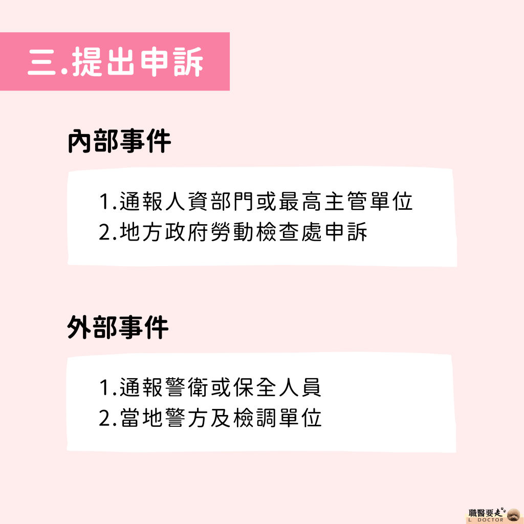 依前述法令,雇主必須要作出預防措施以及訂定相關處理流程,因此若公司沒有明確通報流程,或雇主未依規定辦理,勞工可以向勞動檢查處申訴!