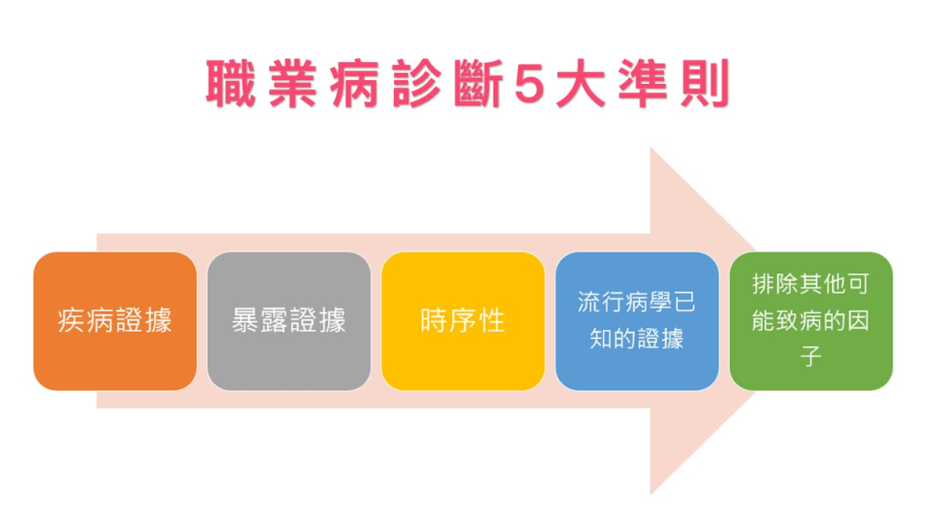 職業病認定需要「因果關係」的判斷(依《職安法細則》第6條規定),而認定上需由「職業醫學科醫師」根據以下職業病診斷五大準則進行整體評估: