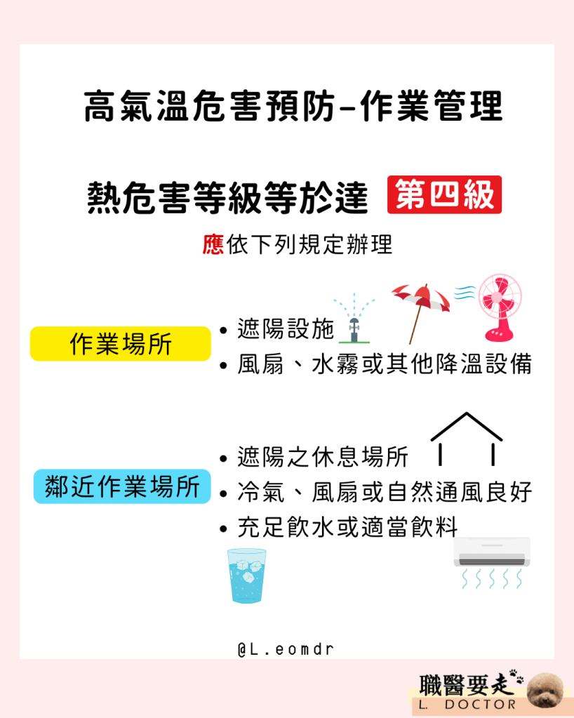 - 熱危害風險第4級:不得使勞工從事重體力作業。
