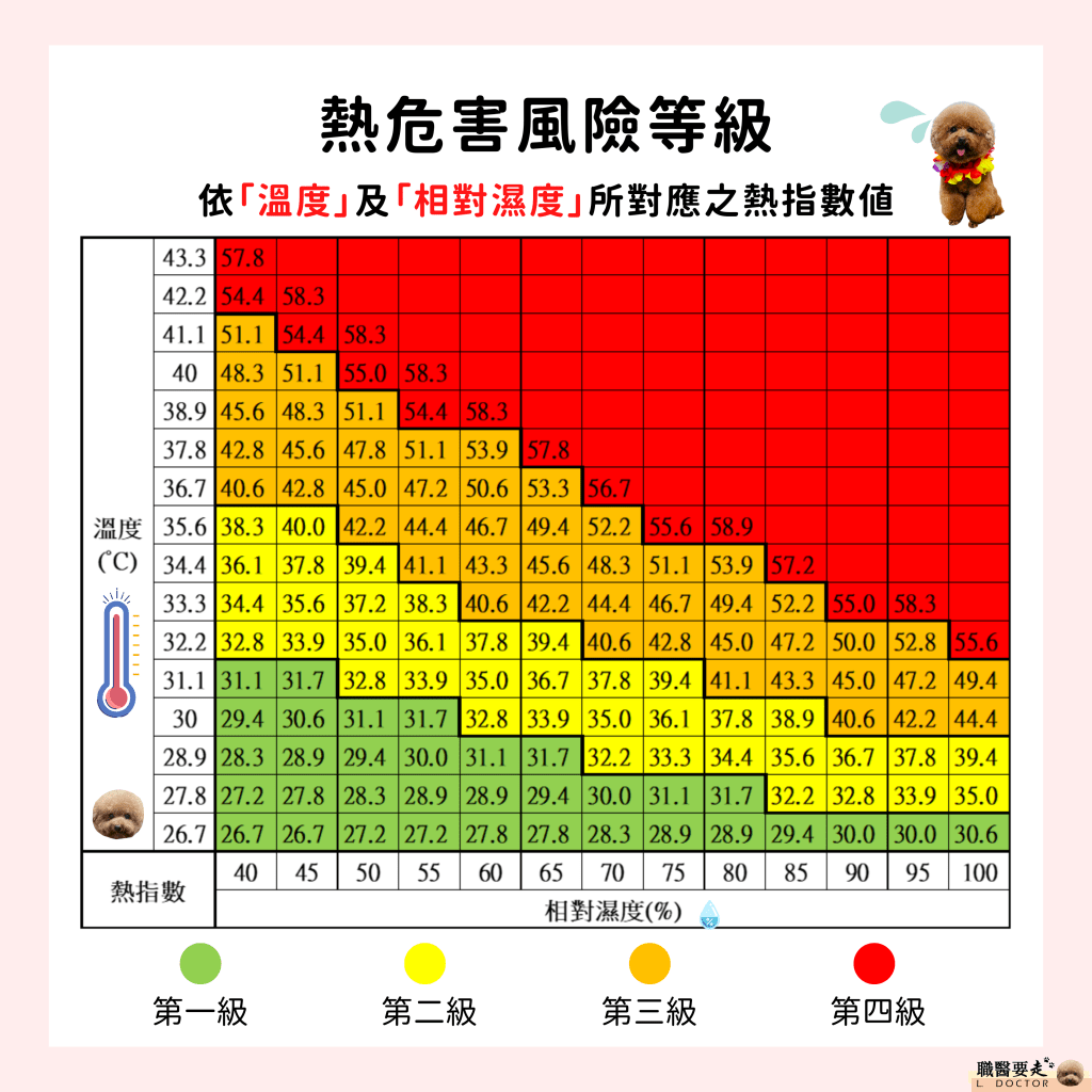 針對戶外工作者的熱指數等級,依「溫度」及「相對濕度」所對應之熱指數值,劃分4個等級,每個等級有不一樣的建議措施,分級標準可參考下圖: