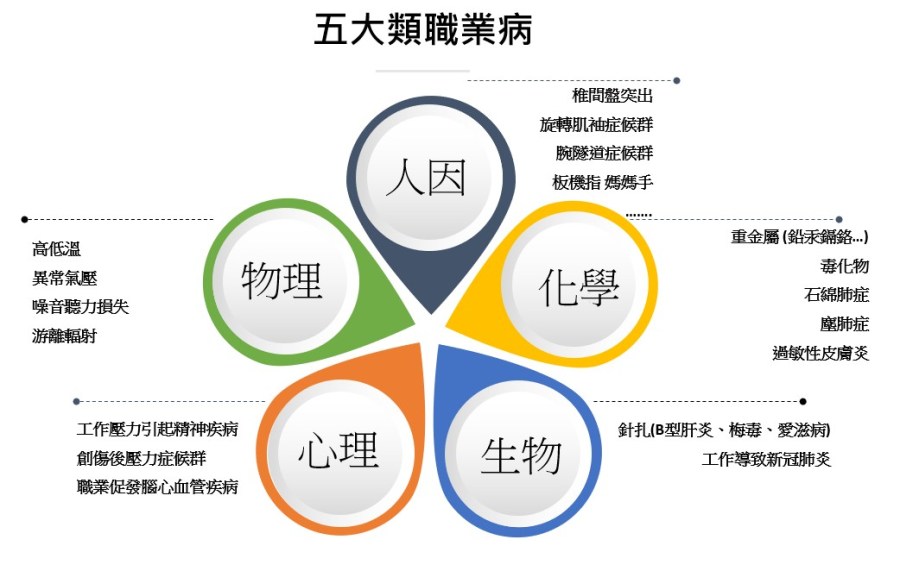 什麼是職業病呢?職業病是指因執行職務暴露在某些危害因子中,累積導致身體產生疾病,大多並不會立刻發病,但在持續暴露後則可能產生問題。勞動部職業安全衛生署將職業病種類分成五大類:
