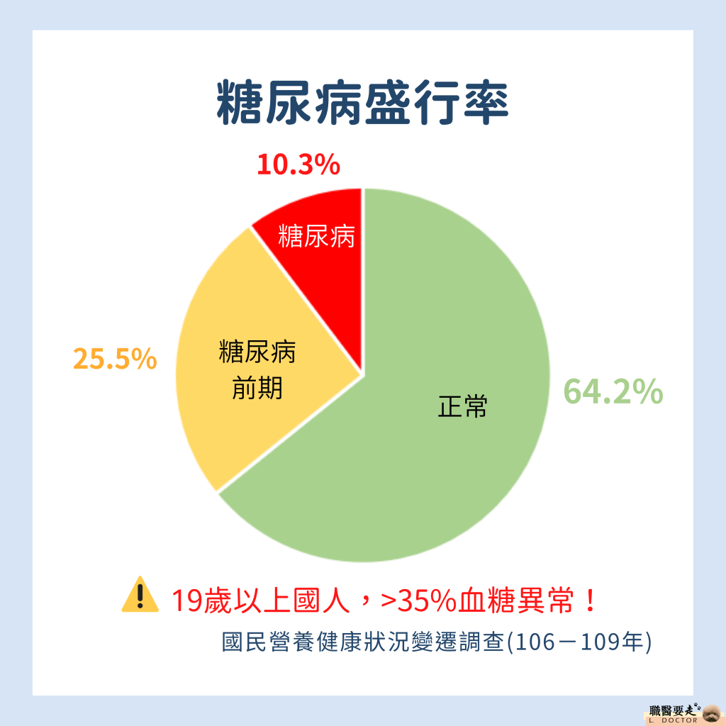 根據國民健康署公布的民國106-109年「國民營養健康狀況變遷調查」中,關於空腹血糖的量測,在隨機抽樣的5千多位國人中,19歲以上國人的【糖尿病】盛行率為10.3%(男性11.5%;女性9%)。而【糖尿病前期】的盛行率,則高達25.5%(男性29.1%;女性22%)。