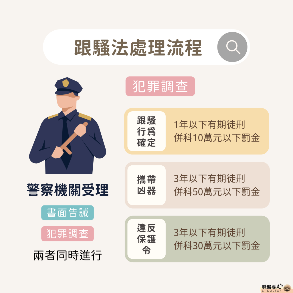 實行跟蹤騷擾行為者:處一年以下有期徒刑、拘役或科或併科新臺幣10萬元以下罰金。