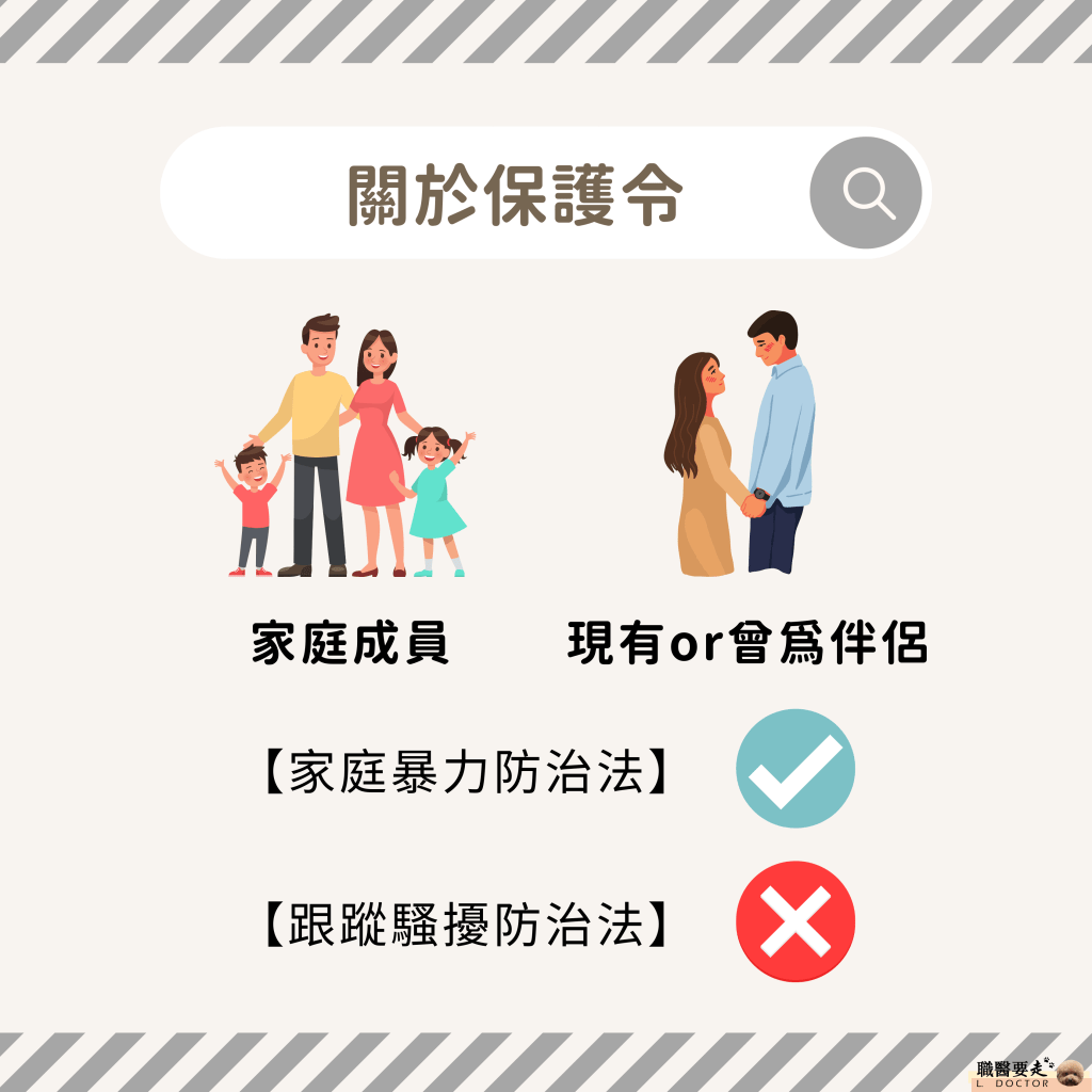 雖然根據法規內容,【家庭成員間】、【現有或曾經伴侶間】之跟蹤騷擾行為,若要申請保護令,可依《家庭暴力防治法》規定聲請民事保護令。