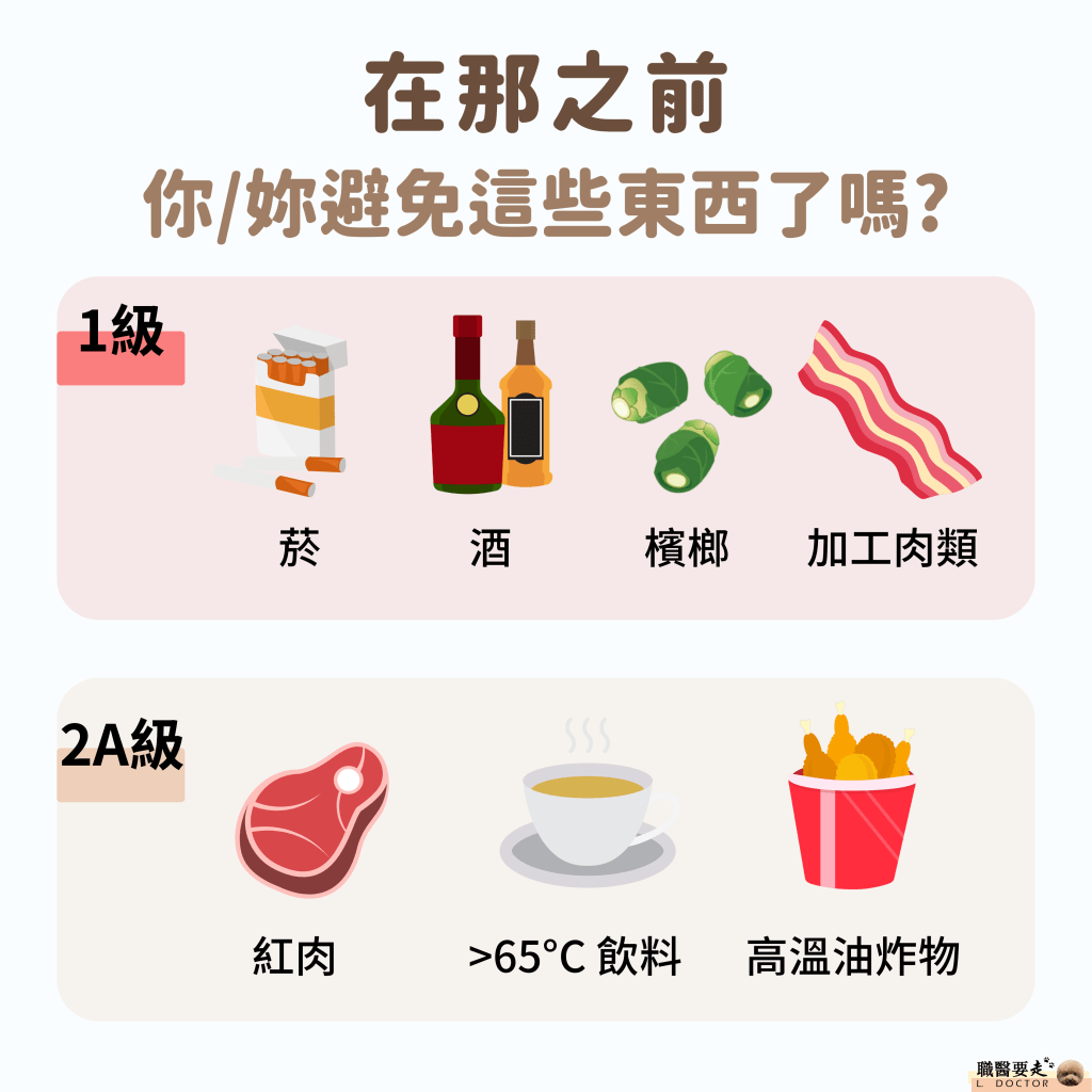 - EX:紅肉、>65°C飲料、輪夜班工作、高溫油炸釋出物…