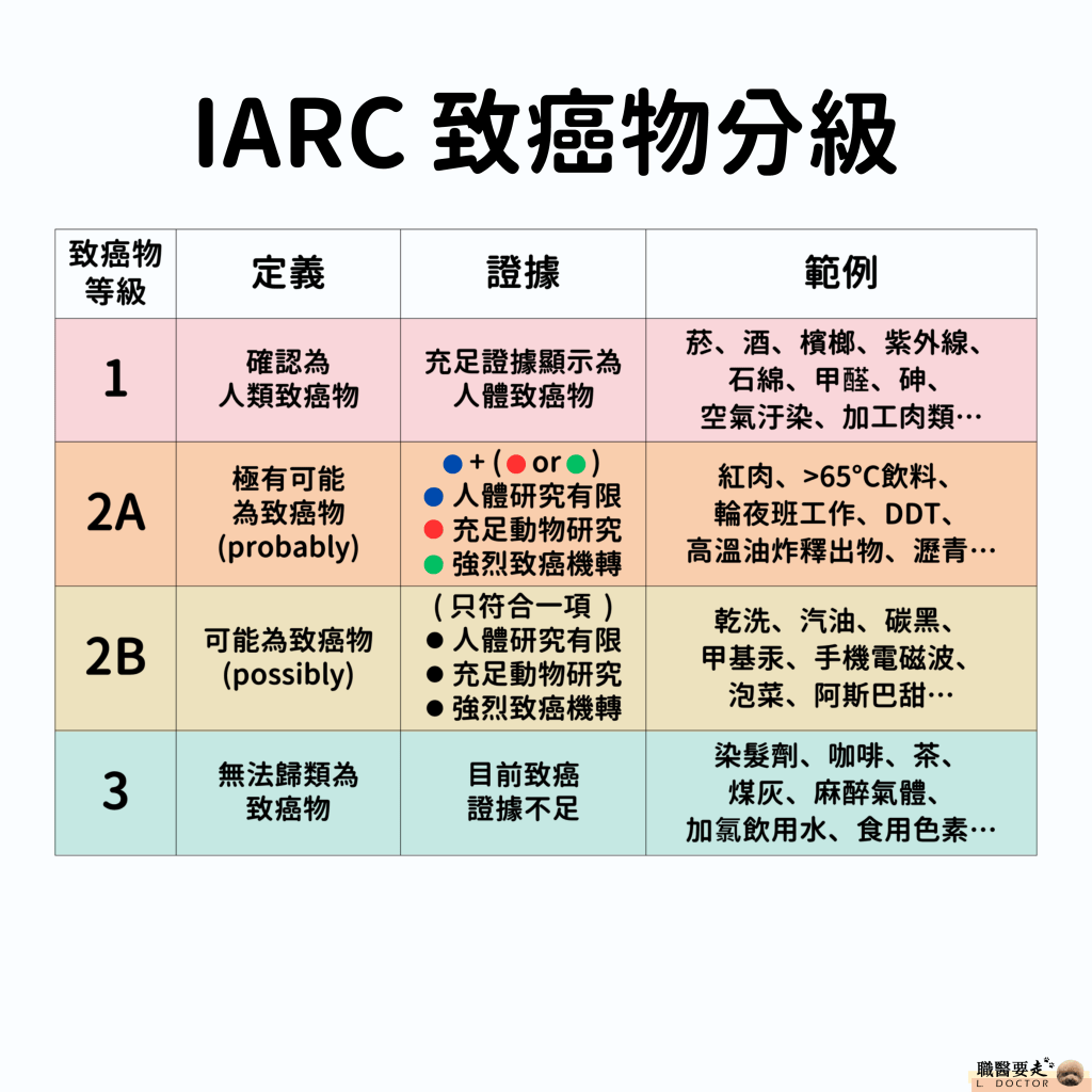 IARC會統整世界上癌症相關研究,並定期開會討論,根據每種物質的致癌可能性區分成以下等級: