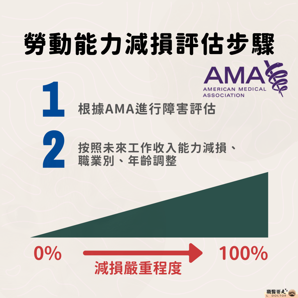 2.再依據【美國永久失能評估準則】進行受傷病當時的未來工作收入能力減損、職業別、年齡做減損百分比的調整。