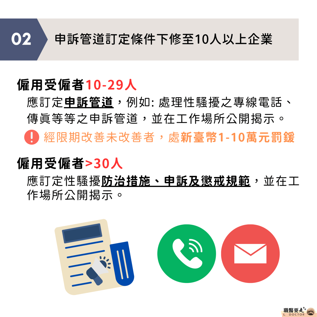 一、僱用受僱者10-29人,應訂定申訴管道,例如處理性騷擾之專線電話、傳真、專用信箱、電子信箱或其他指定之申訴管道,並在工作場所公開揭示。(經限期改善未改善者,處新臺幣1-10萬元罰鍰。)