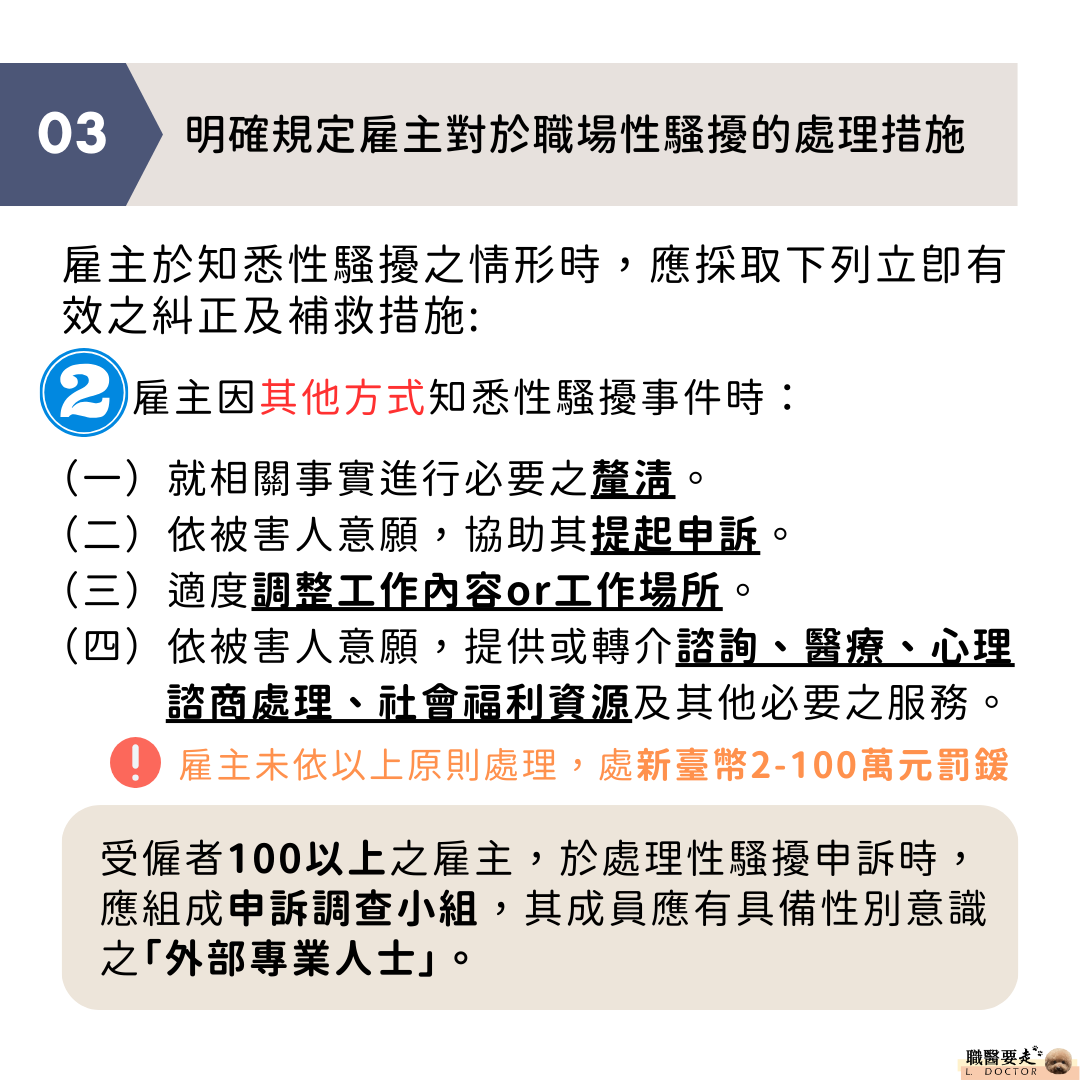 雇主於知悉性騷擾之情形時,應採取下列立即有效之糾正及補救措施;即使被害人及行為人分屬不同事業單位,但只要具共同作業或業務往來關係者,也需遵守以下原則: