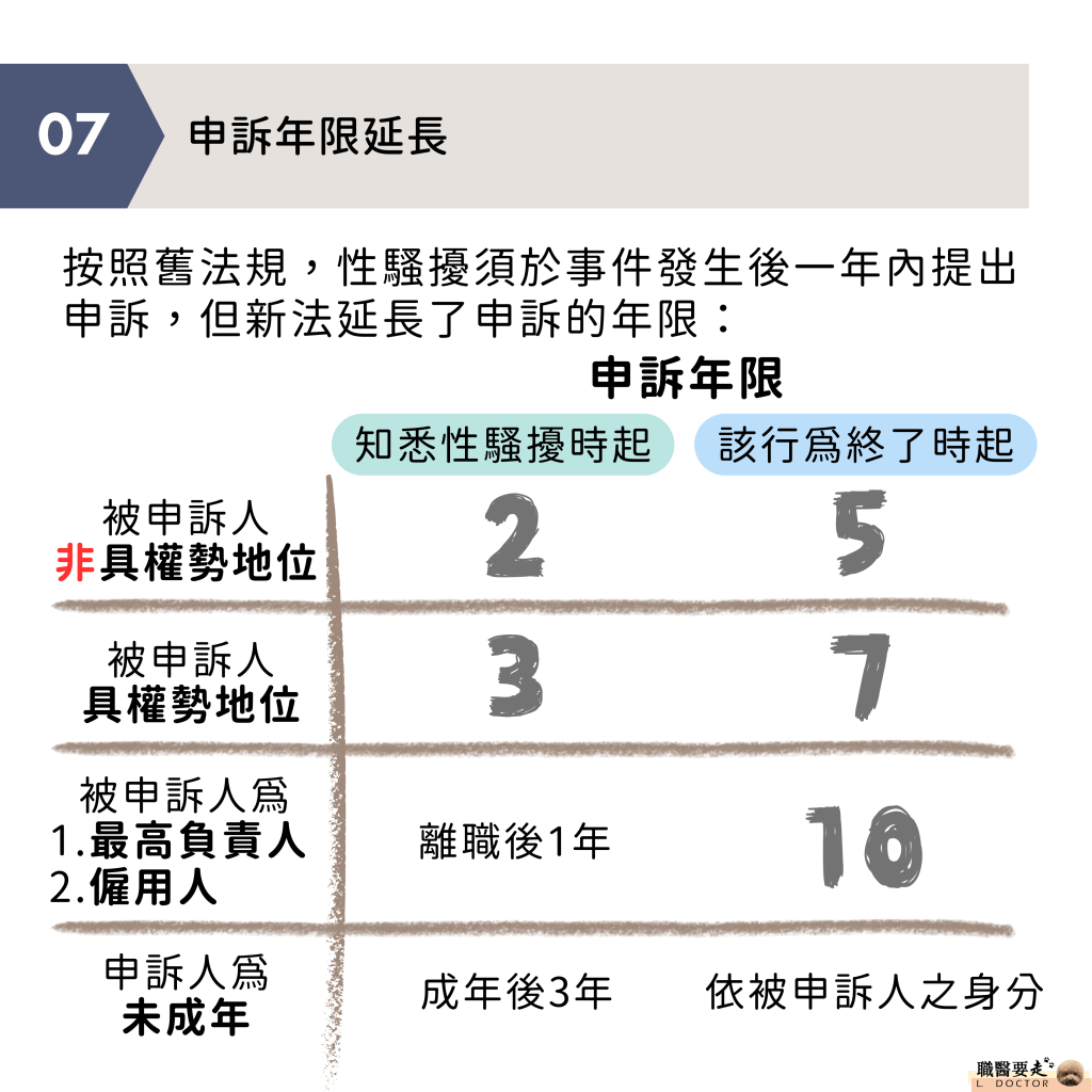 按照舊法規,性騷擾須於事件發生後一年內提出申訴,但新法延長了申訴的年限: