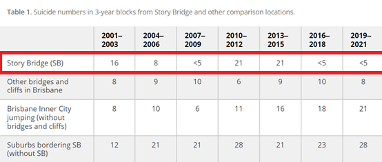 1.Kõlves K, Leske S, De Leo D. From suicide surveillance to restricting access to means: A time series study of suicide prevention at the Story Bridge. Australian & New Zealand Journal of Psychiatry. 2023;57(8):1184-1186. doi:10.1177/00048674231177960