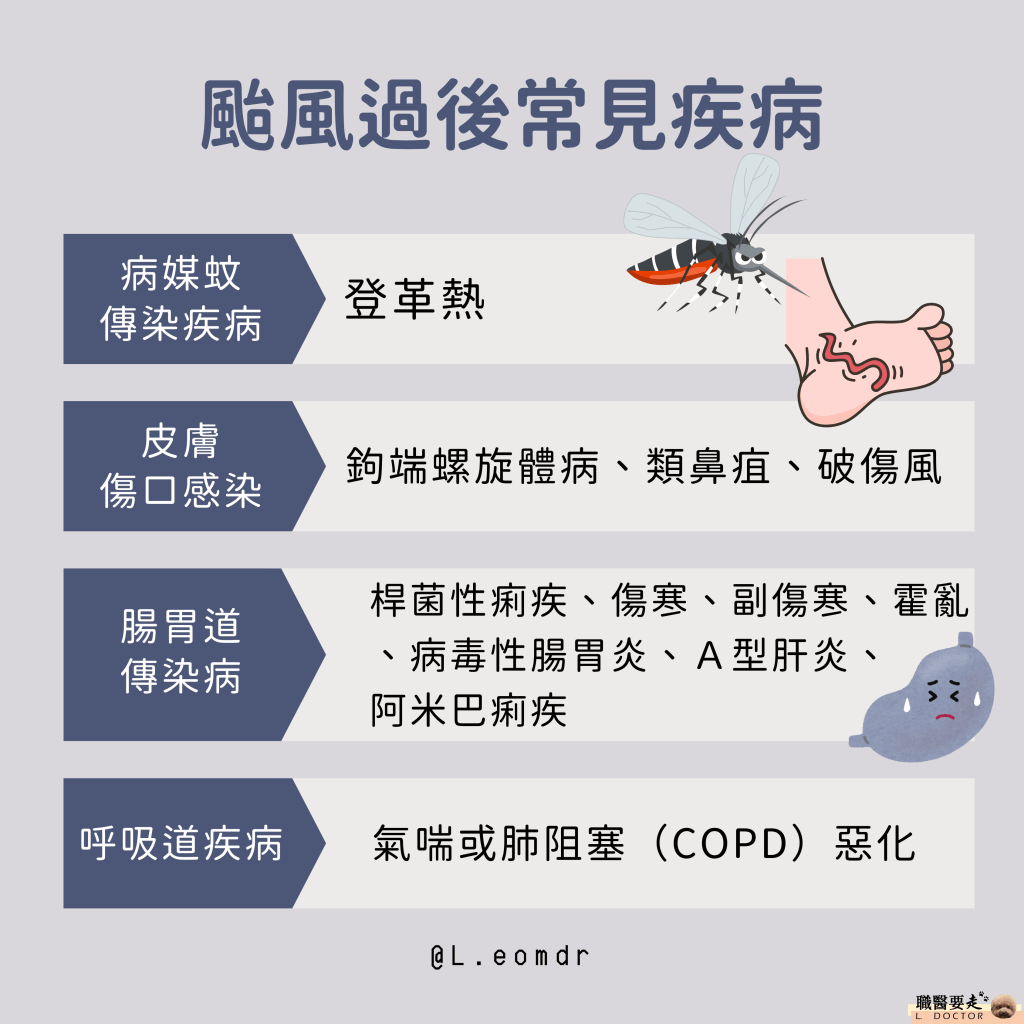 颱風天過後,民眾易因接觸污水、污泥、環境積水病媒蚊孳生、或潮濕發霉等原因,造成某些疾病容易產生,以下簡介常見的疾病,以及怎麼樣預防這些疾病的產生。
