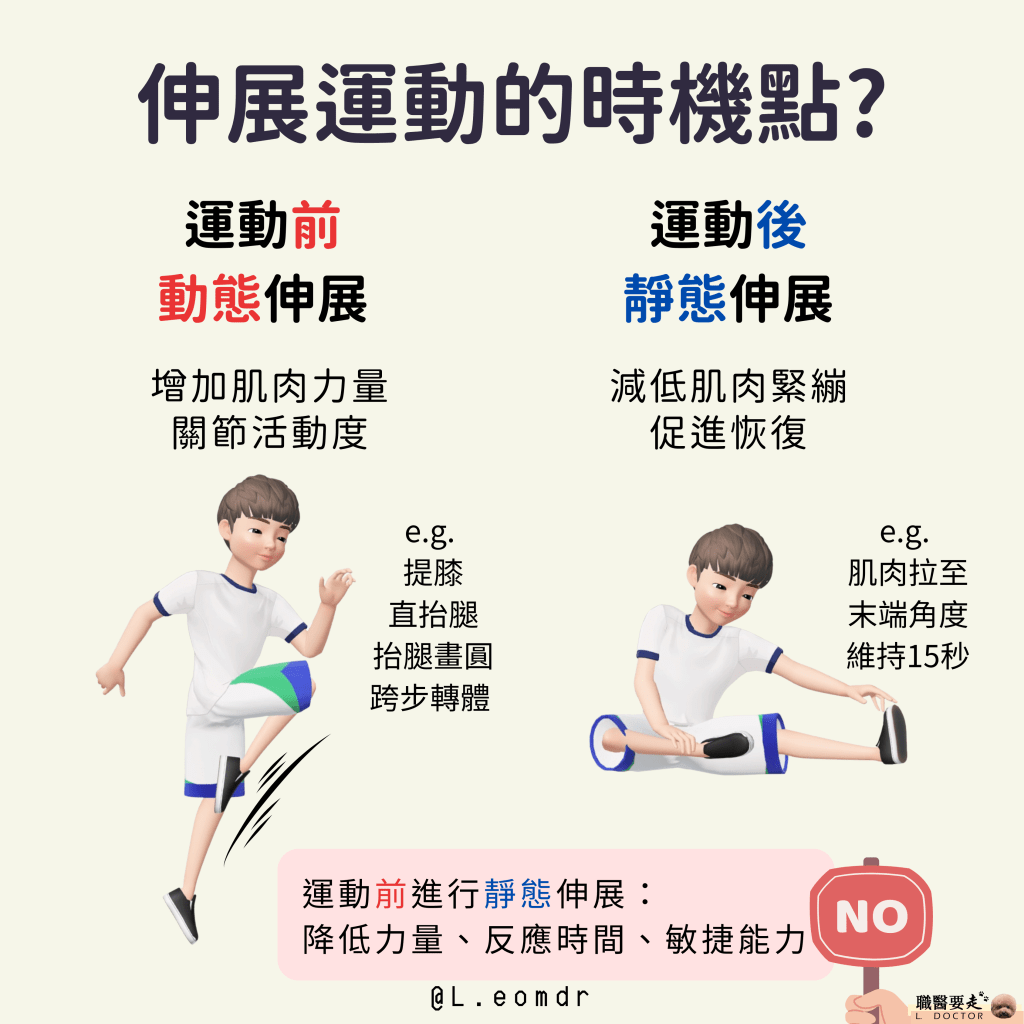 綜合以上,建議運動前採用動態伸展,運動後做靜態伸展。