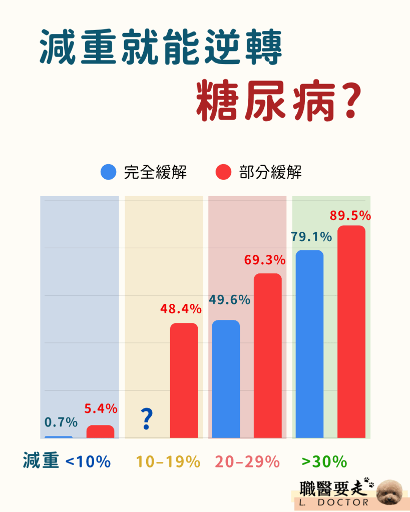 - 降低超過10%體重,糖尿病部分緩解的機率就接近50%