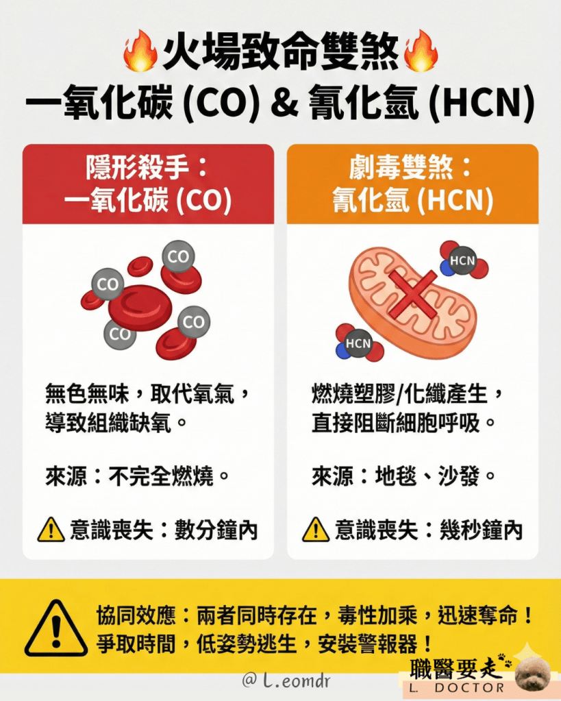 - 2.氰化氫 (HCN):毒性又比 CO 強「數十倍」,直接關閉細胞的呼吸鏈,幾秒鐘就可能導致死亡。